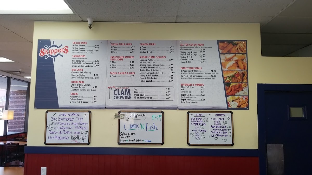 “ This place is the BOMB !!! Went last night it was pretty busy. I ordered 4 piece Fish & Chips and Clam Chowder, My wife had the Grilled Salmon. We were very pleased with the quality and quantity of the food. The Clam Chowder was really hot the way a soup should be, the Fish was piping hot, crispy and so moist in the inside. My wife loved her Salmon and the Coleslaw. We were served very quickly not really expected for how busy they were. When in CA I use to visit Long Jon Silvers pretty often, Here in Utah now I would go to the Market Street Grill in South Jordan to satisfy my cravings for Fish & Chips 14.99 for two small pieces of fish and it is just okay a little dry. Skippers has Bigger pieces of fish and 4 pieces was 9.99 or 10.99 and very hot and moist. I will be back my new favorite place. !!! ”